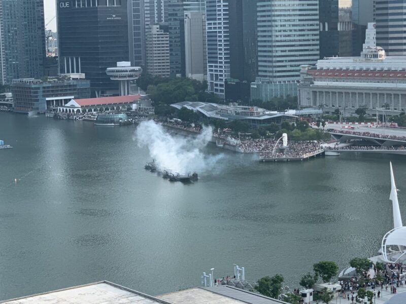 花火だけでなく、戦闘機が超高速で飛んだり、大きな飛行機がマリーナベイサンスの上空を飛行したり、落下傘部隊、大砲、船上ライブなど様々な見どころがあり、観光客も楽しく観覧できます。