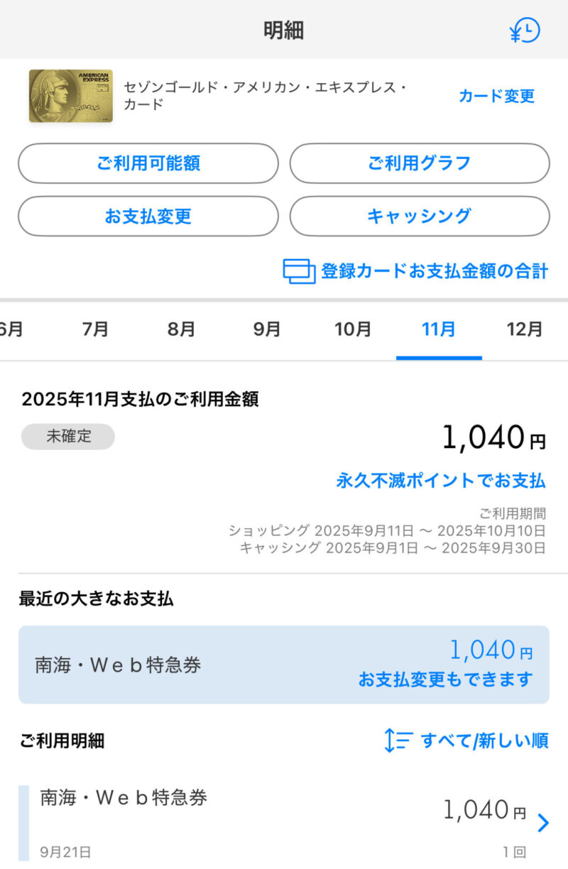 次に「利用付帯」のクレカに関して、旅行に関連する支出を決済します。
